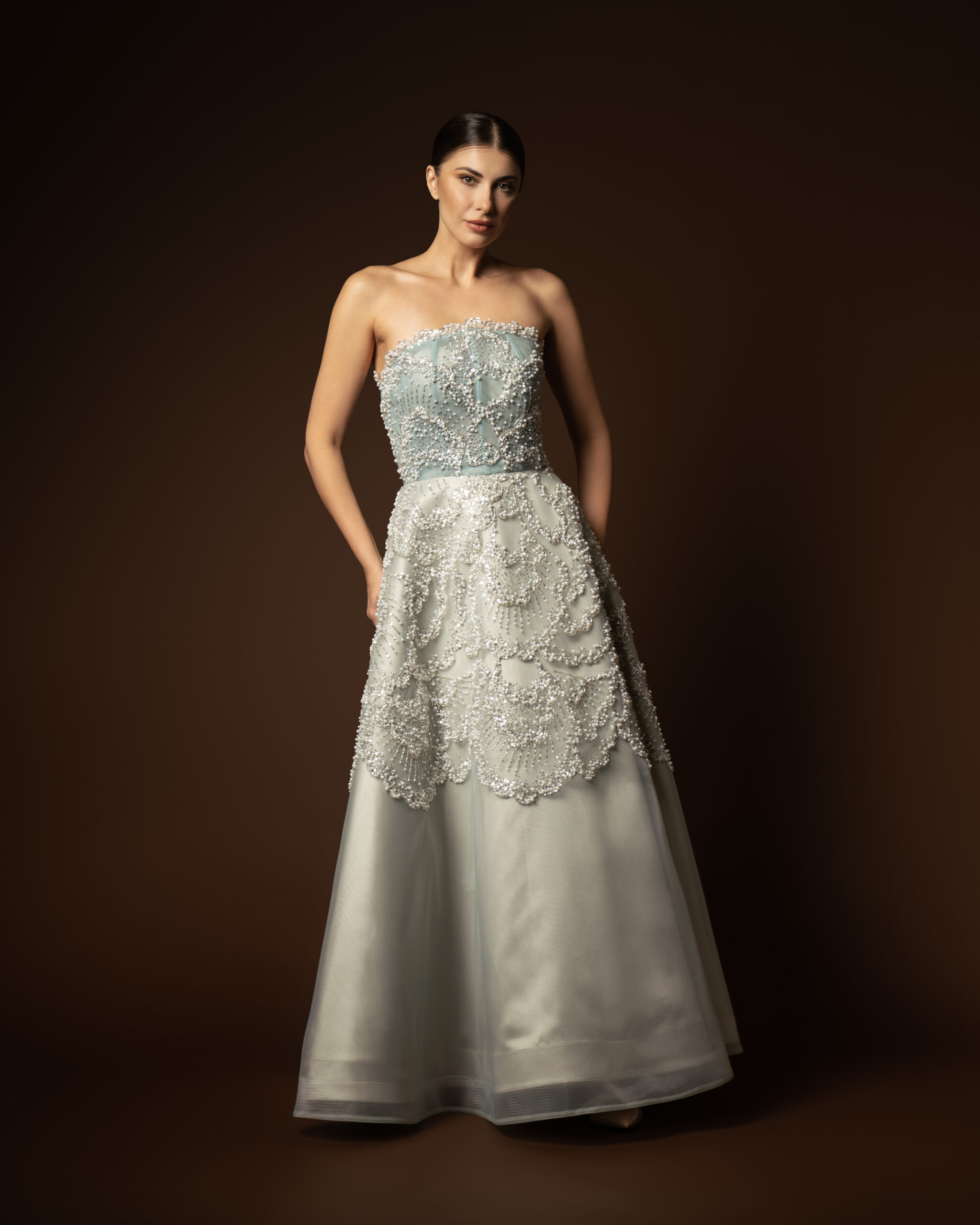 The “Aloure” gown is a pearl-encrusted masterpiece. A strapless A-line dress in a refreshing seafoam mint shade, featuring a corset bodice and a stunning scalloped pattern of pearls and silver beads throughout.