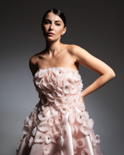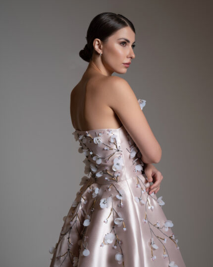 Embrace a mood of sophisticated romance with the “Althea” Evening Gown. This captivating dress combines a sleek, modern color palette with whimsical, garden-inspired details.
