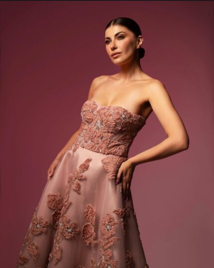 The defining feature of the “Arlise” is its exquisite texture. The dress is lavishly embellished with rows of pearls and silver beads arranged in a mesmerizing scalloped, scale-like pattern. This heavy beadwork cascades from the bodice down the skirt, catching the light beautifully and adding a touch of opulent glamour to the fresh color.