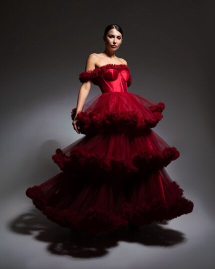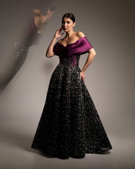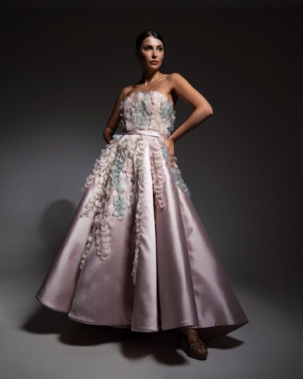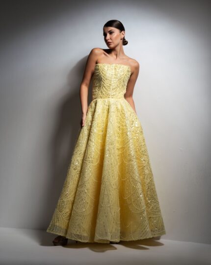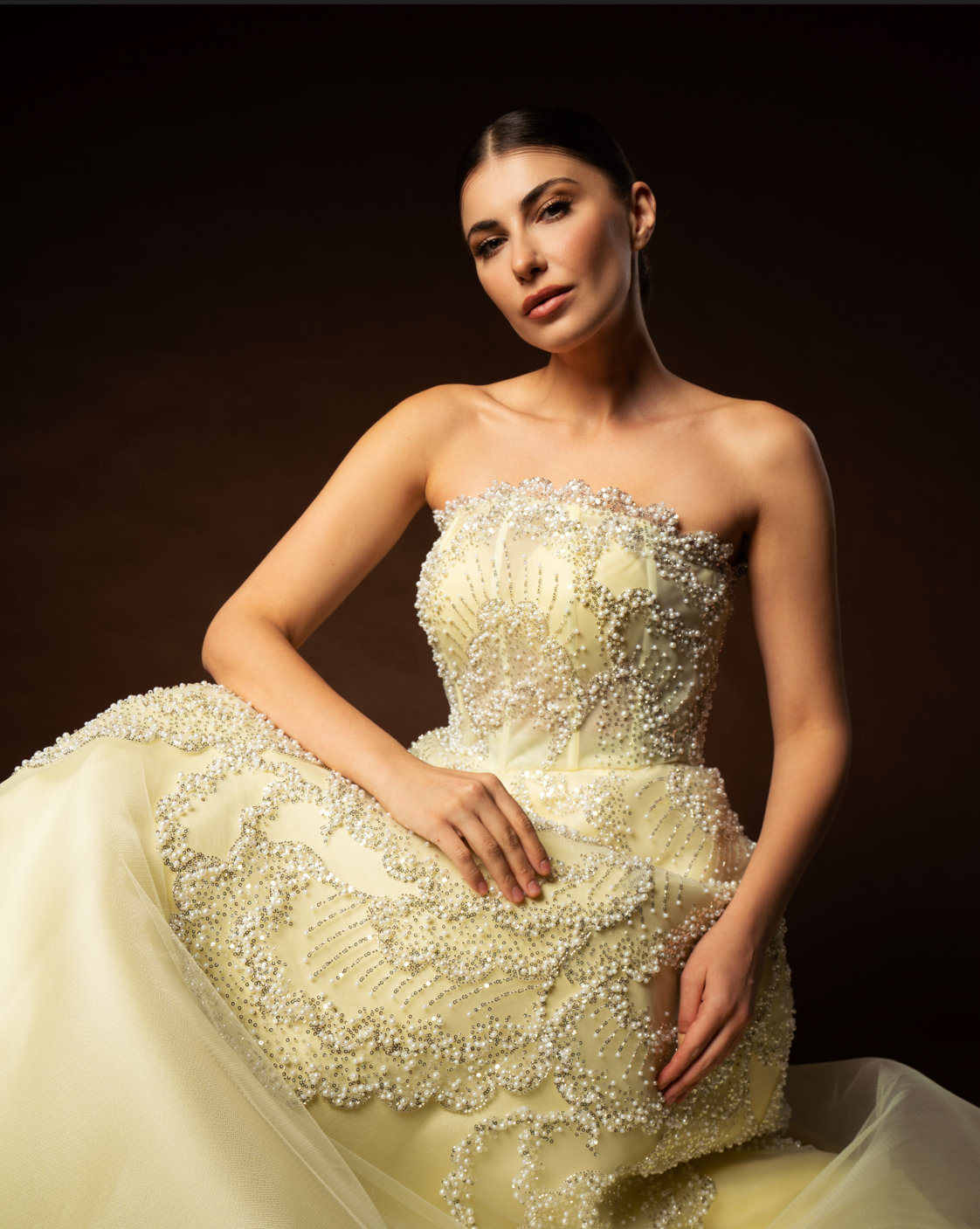 The “Arlise” gown is a beam of sunshine. A strapless A-line dress in a pastel yellow shade, featuring a corset bodice and a stunning scalloped pattern of pearls and silver beads throughout. A fresh and luxurious choice for special occasions.