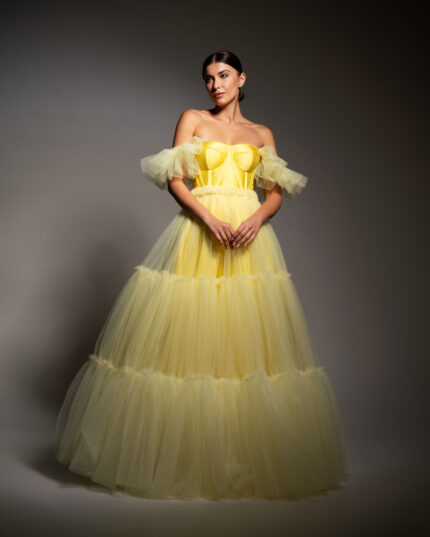 Illuminate the room with the “Arlise” Evening Gown. This radiant piece captures the warmth of sunlight, rendered in a soft, pastel yellow hue that exudes joy and sophistication.