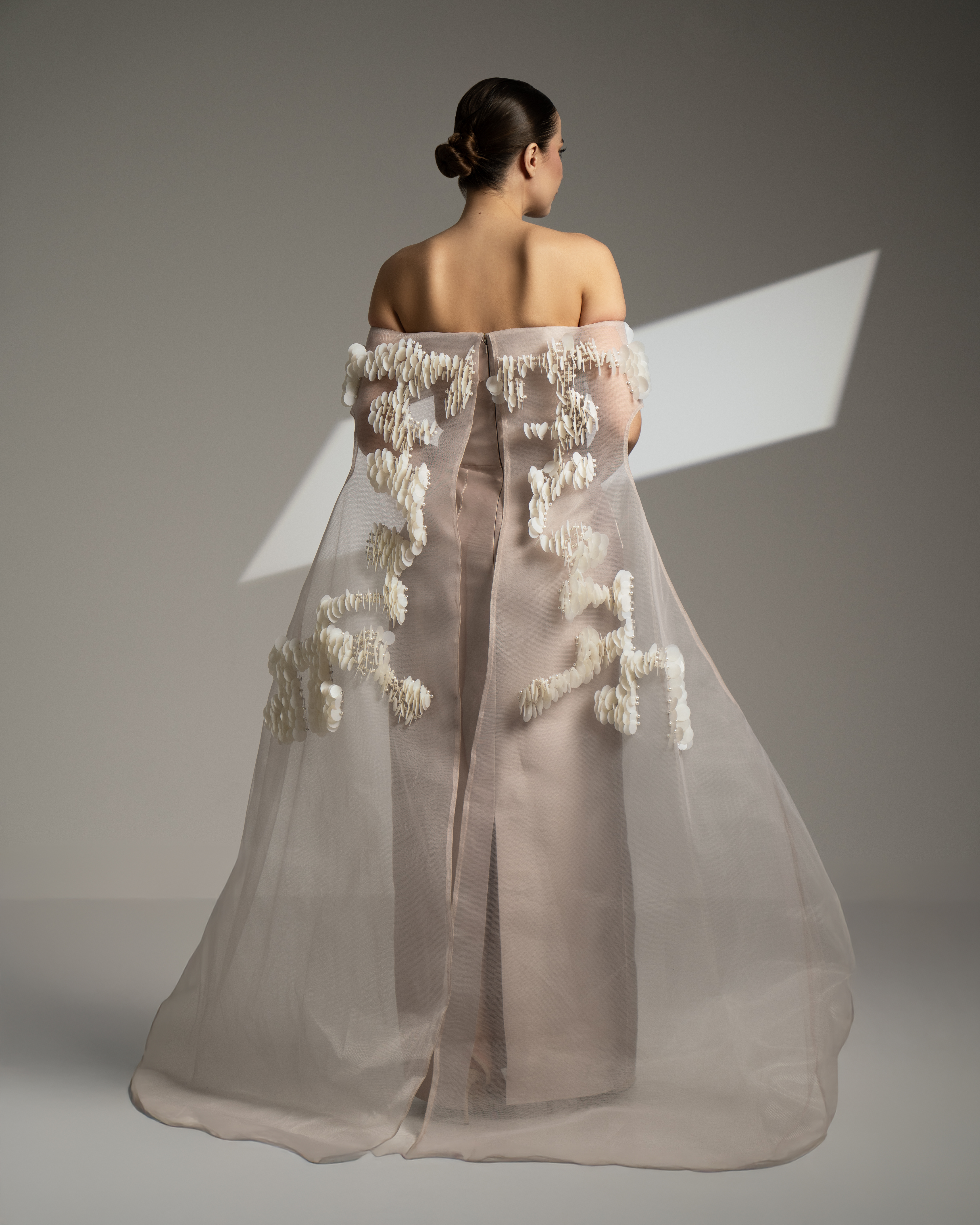 The defining feature is the dramatic off-the-shoulder neckline. It showcases a voluminous, sculptural fold that wraps around the arms, serving as a canvas for exquisite detailing. Scattered dark beaded clusters and 3D floral accents adorn this ruffle, adding a touch of texture and sparkle to the smooth satin finish.