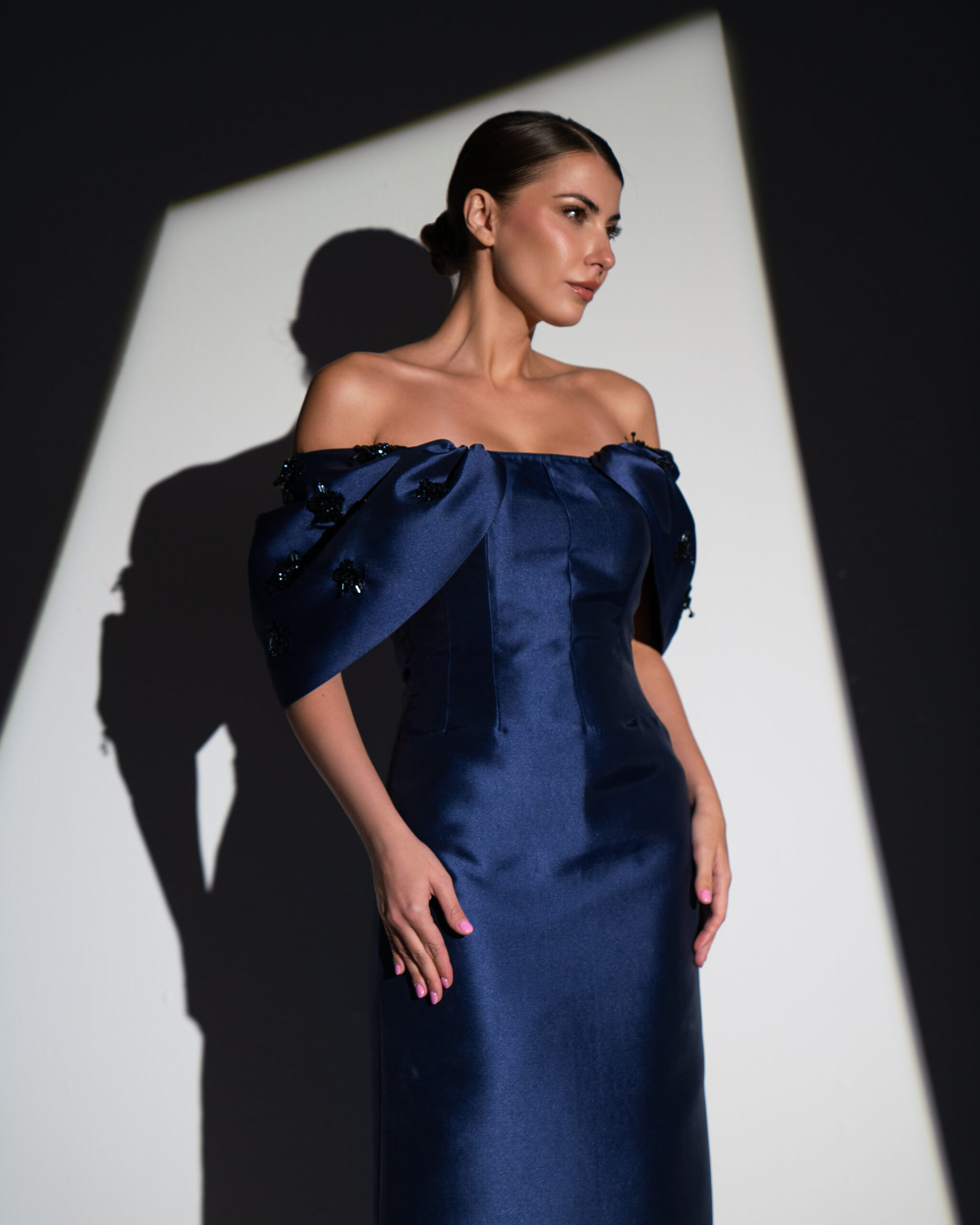 The “Avel” gown is a vision of regal elegance. A sleek midnight navy satin column dress featuring a dramatic off-the-shoulder folded neckline adorned with scattered beaded accents. Finished with a back slit for movement, this dress offers a timeless and polished evening look.