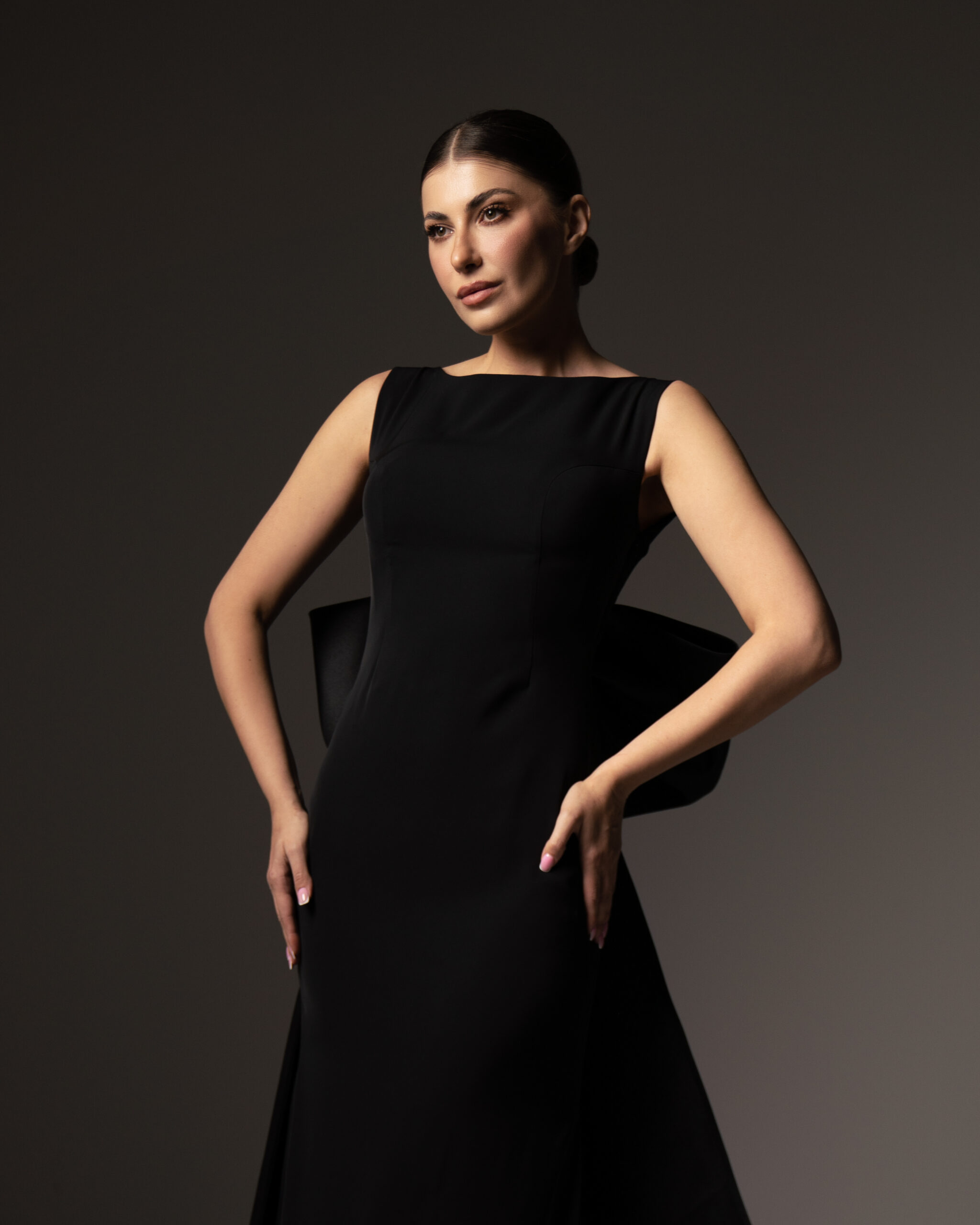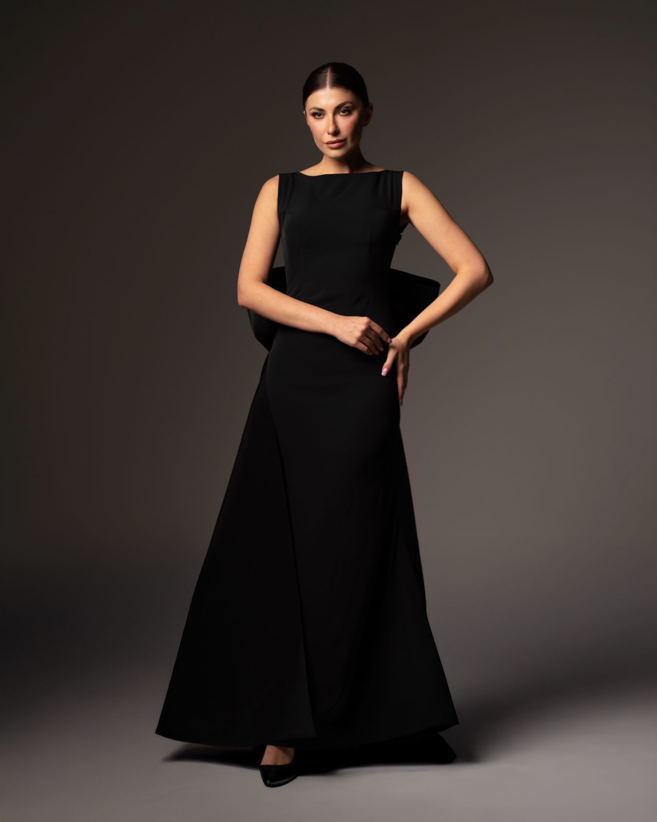 The “Edina” gown in burgundy is sophisticated drama. A sleek column dress featuring a modest high neckline and show-stopping floor-length cape sleeves. The shoulders are accented with delicate tonal beadwork for a refined finish.