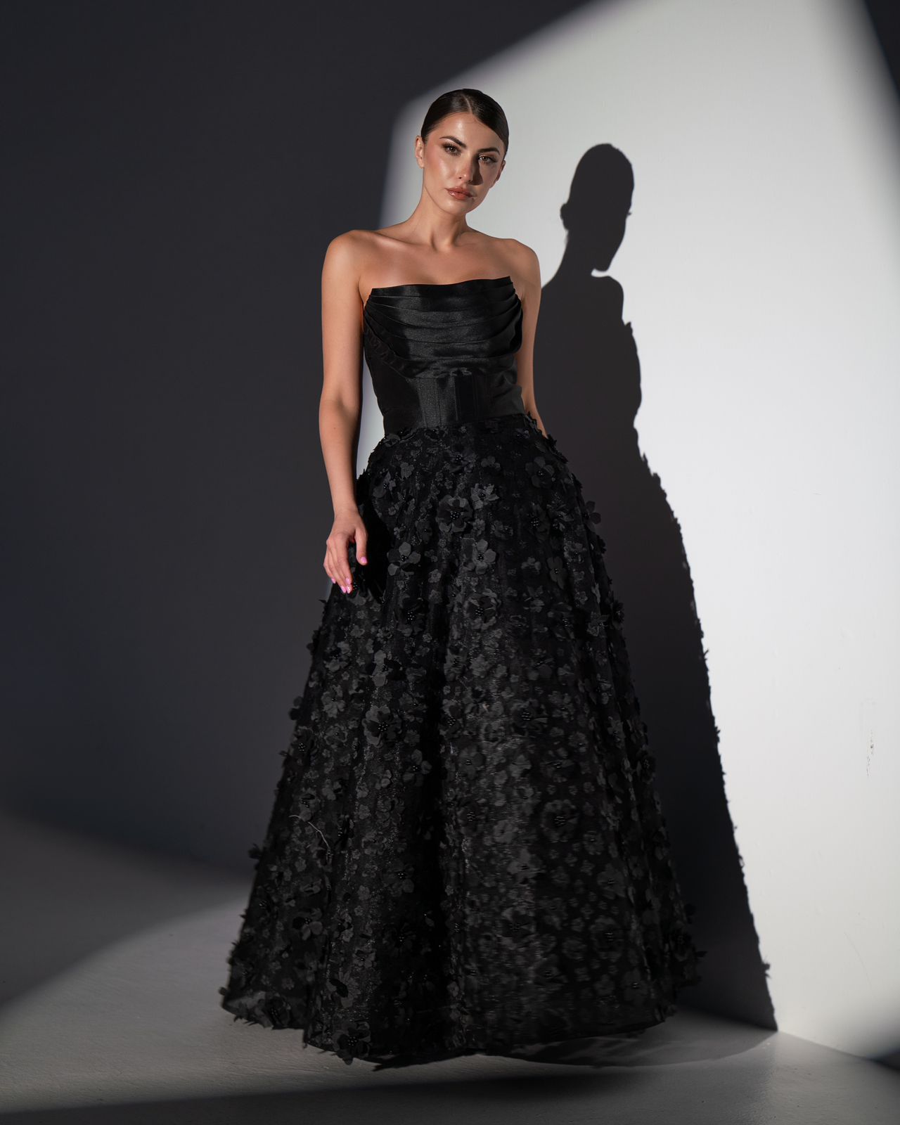 The “Esma” gown defines sophisticated luxury. A strapless black dress featuring a sleek, pleated satin bodice that contrasts beautifully with a voluminous A-line skirt. The skirt is richly adorned with black 3D floral appliqués for a stunning, textured finish.
