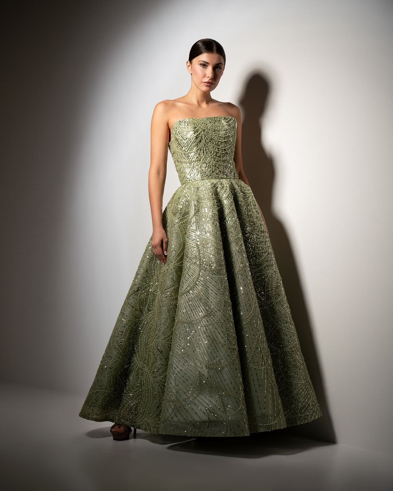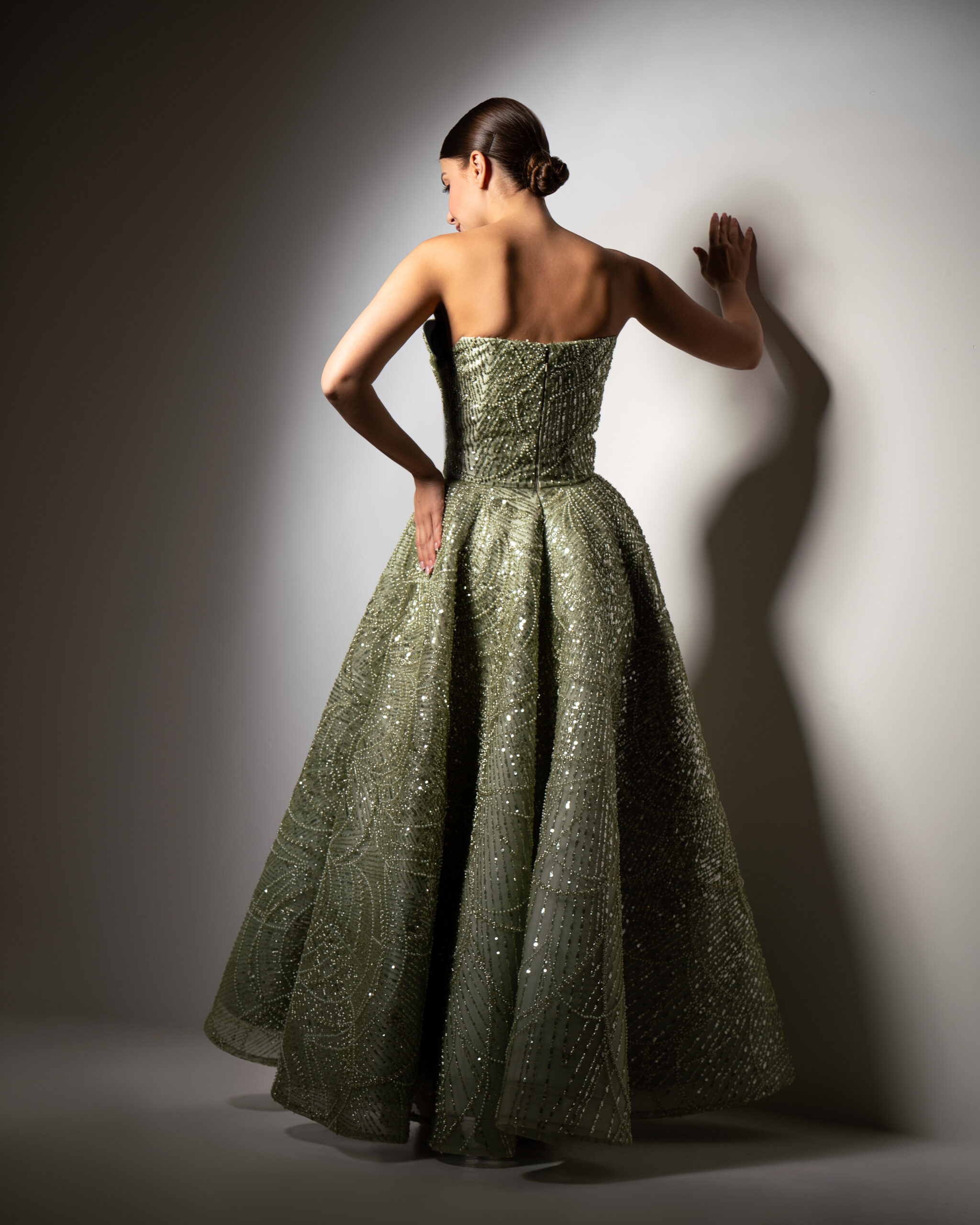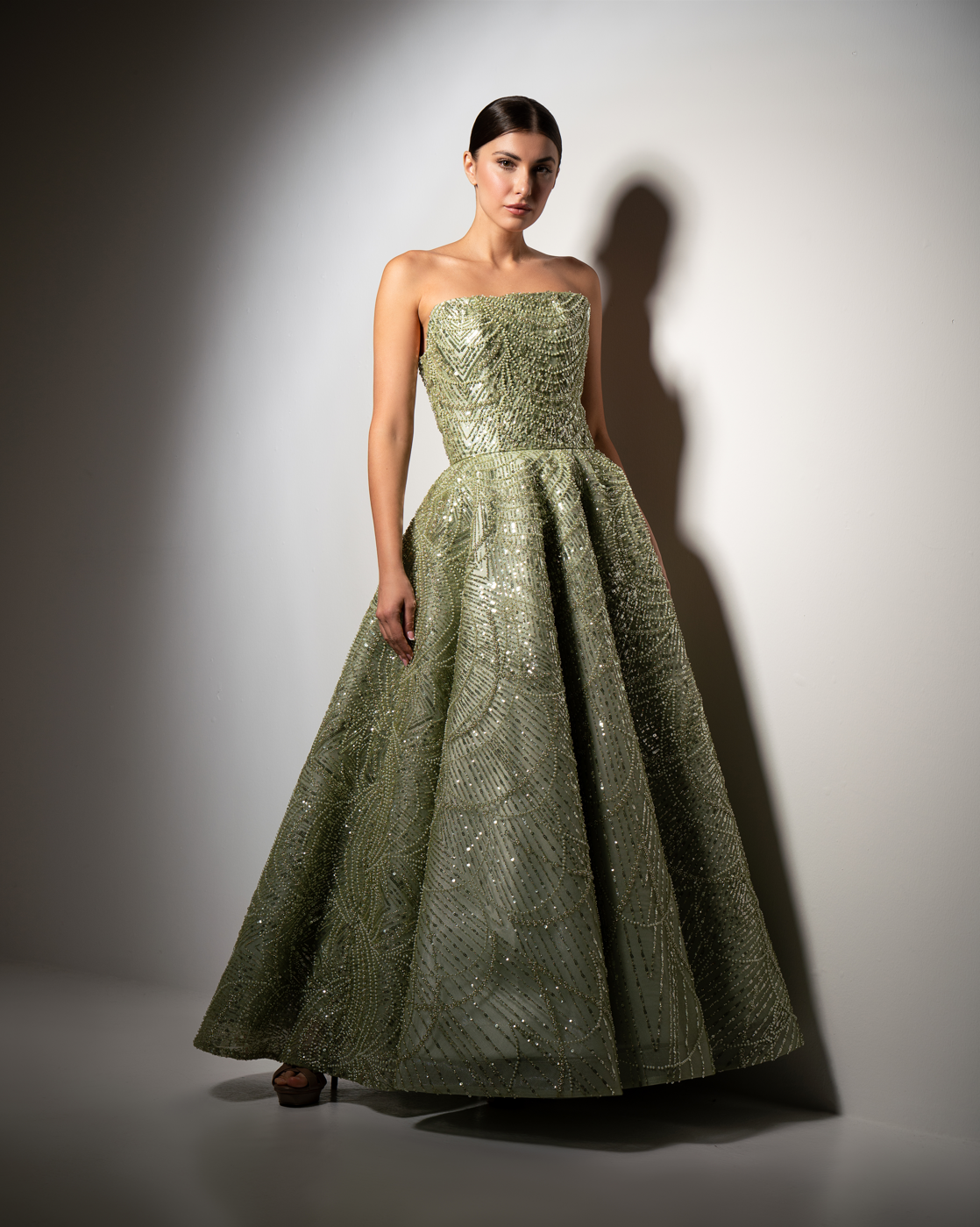The “Jade” gown is a masterpiece of beadwork. This strapless A-line dress in a sophisticated sage green hue features an intricate, all-over geometric sequin pattern. A structured and regal choice for your most formal occasions.