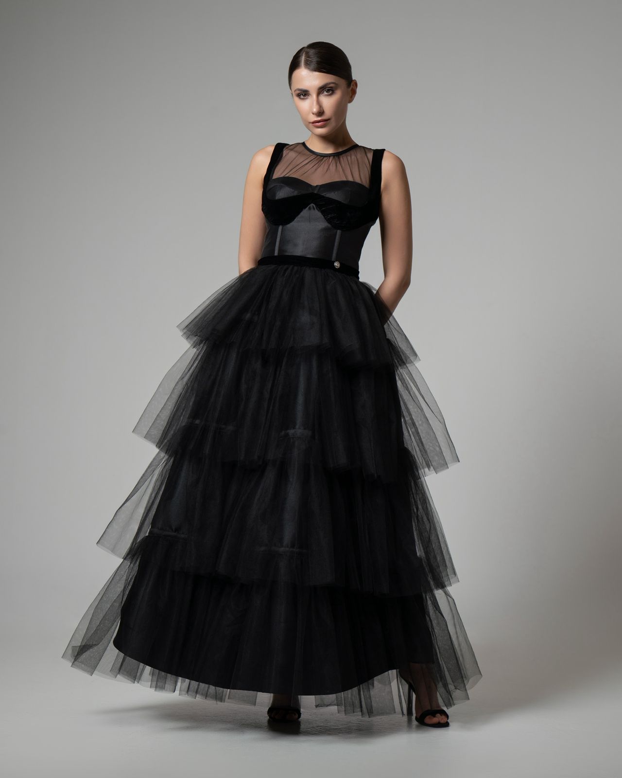 The drama continues into the skirt, which is crafted from multiple layers of tiered black tulle. This creates a voluminous, ballerina-inspired silhouette that moves beautifully as you walk. Whether you are attending a black-tie gala, an evening wedding, or a sophisticated party, the Luna gown offers a perfect blend of edgy style and timeless grace.