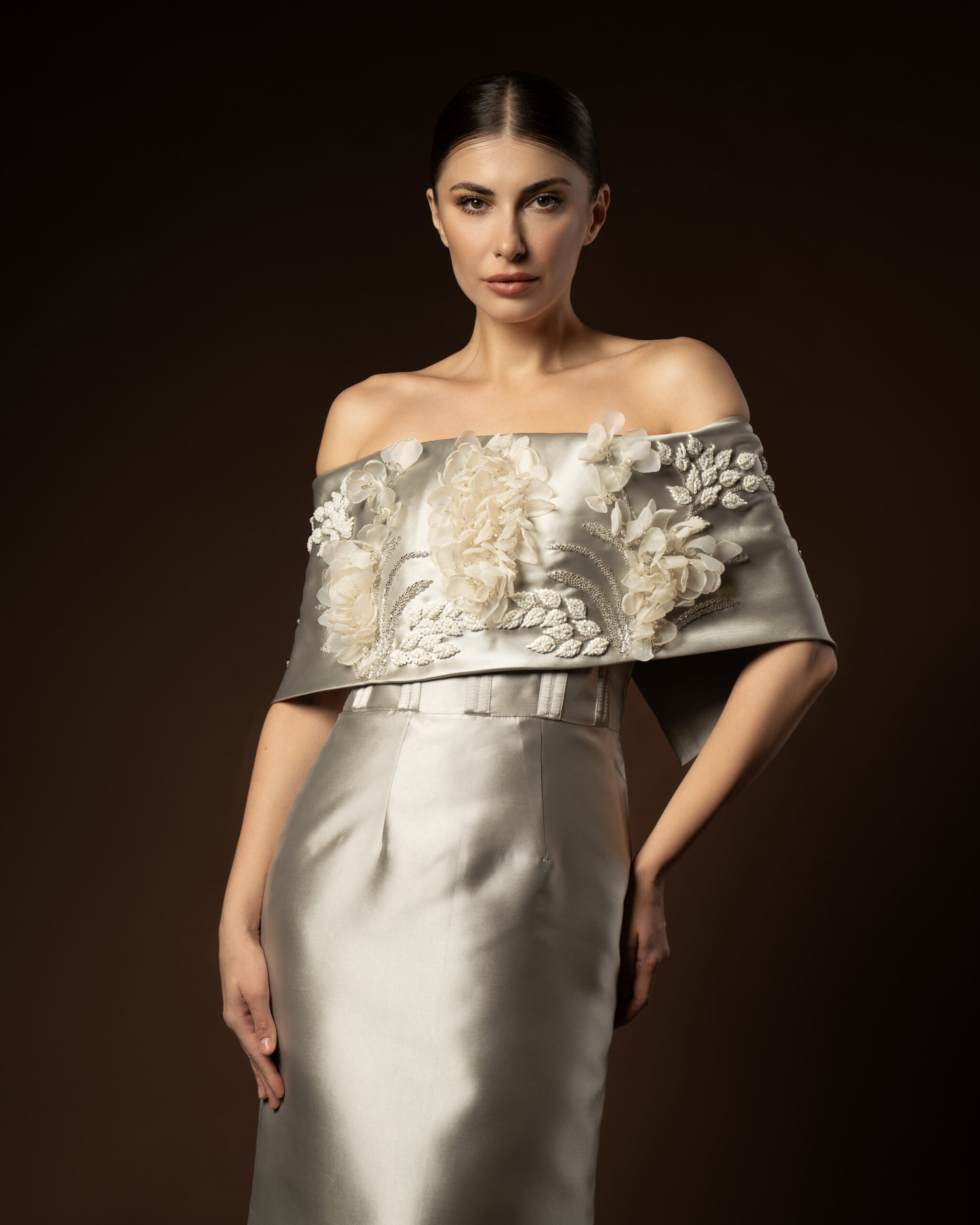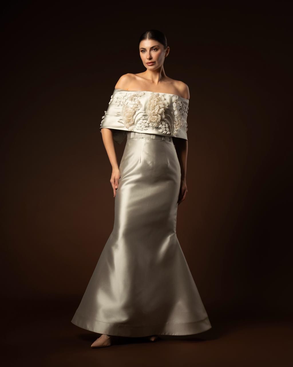 The “Marisé” gown is a vision of metallic grace. A silver satin mermaid dress featuring a dramatic off-the-shoulder folded neckline embellished with 3D floral details. The fitted silhouette flares at the knee for a timeless and elegant finish.