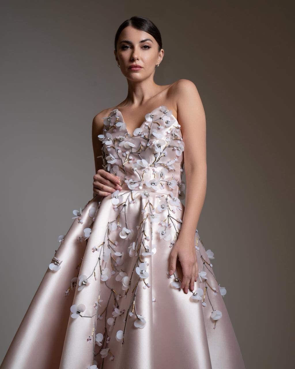 The true highlight of the “Mira” is its exquisite surface design. Intricate, hand-beaded metallic branches wind their way across the bodice and cascade down the skirt. These stems are adorned with delicate 3D petals and crystals, creating a stunning “falling blossom” effect that catches the light and adds depth to the smooth satin.