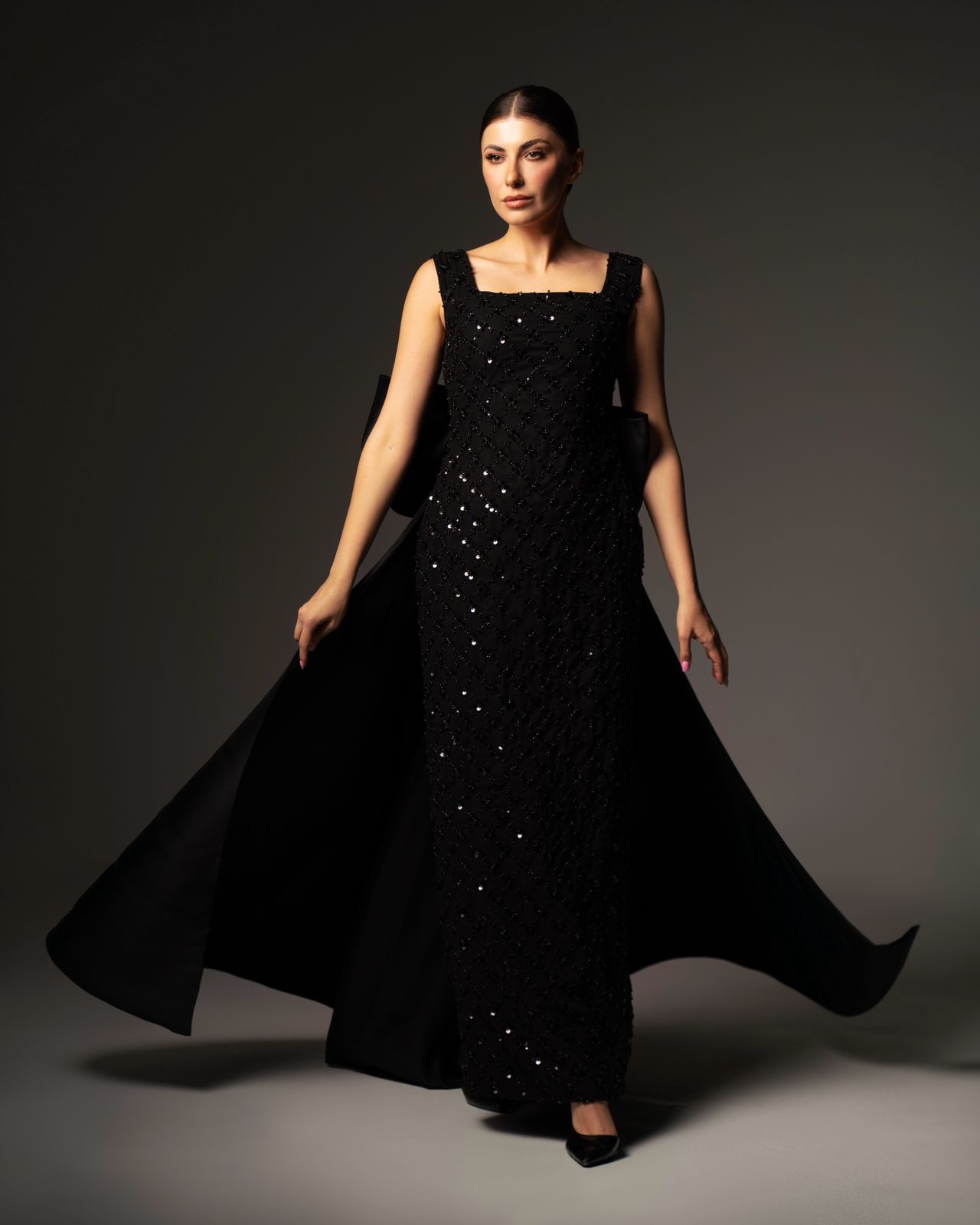 The defining feature of the “Mirelle” is its exquisite texture. The dress is lavishly embellished with rows of pearls and silver beads arranged in a mesmerizing scalloped, scale-like pattern. This heavy beadwork cascades from the bodice down the skirt, catching the light beautifully and adding a touch of opulent glamour to the fresh, summery color.