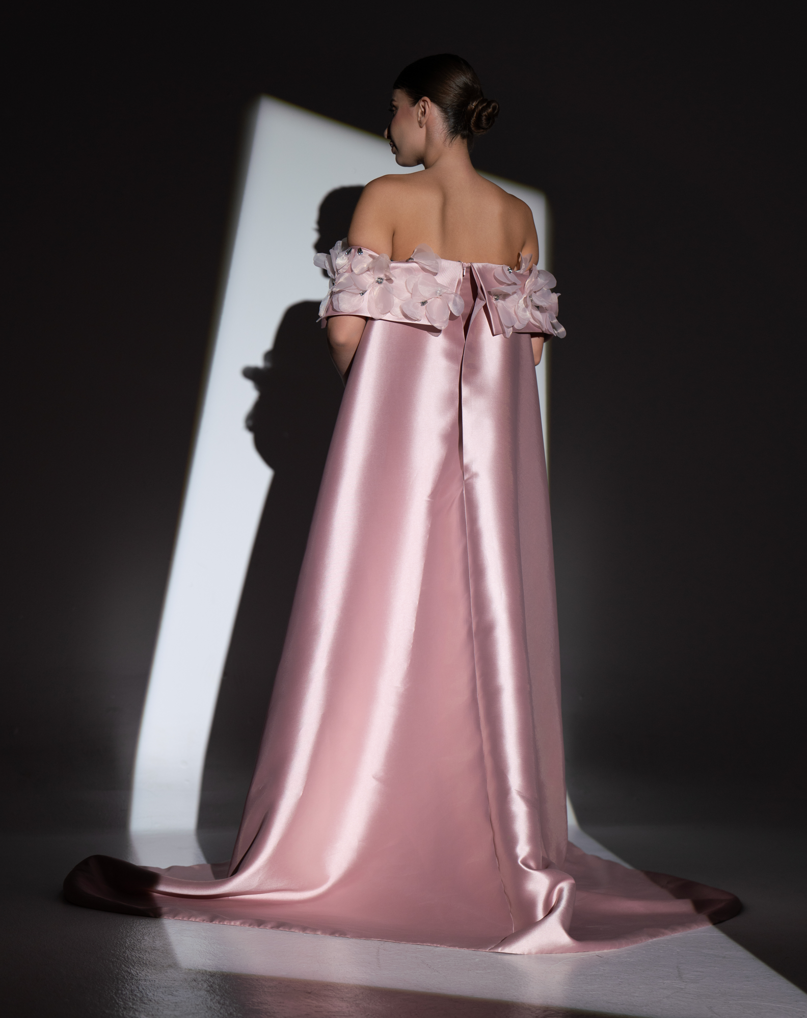 The “Nari” gown is pure sophistication. A sleek column dress in lustrous dusty pink satin, featuring a dramatic floor-length cape attached at the back. The off-the-shoulder neckline is beautifully adorned with 3D floral appliqués for a romantic finish.