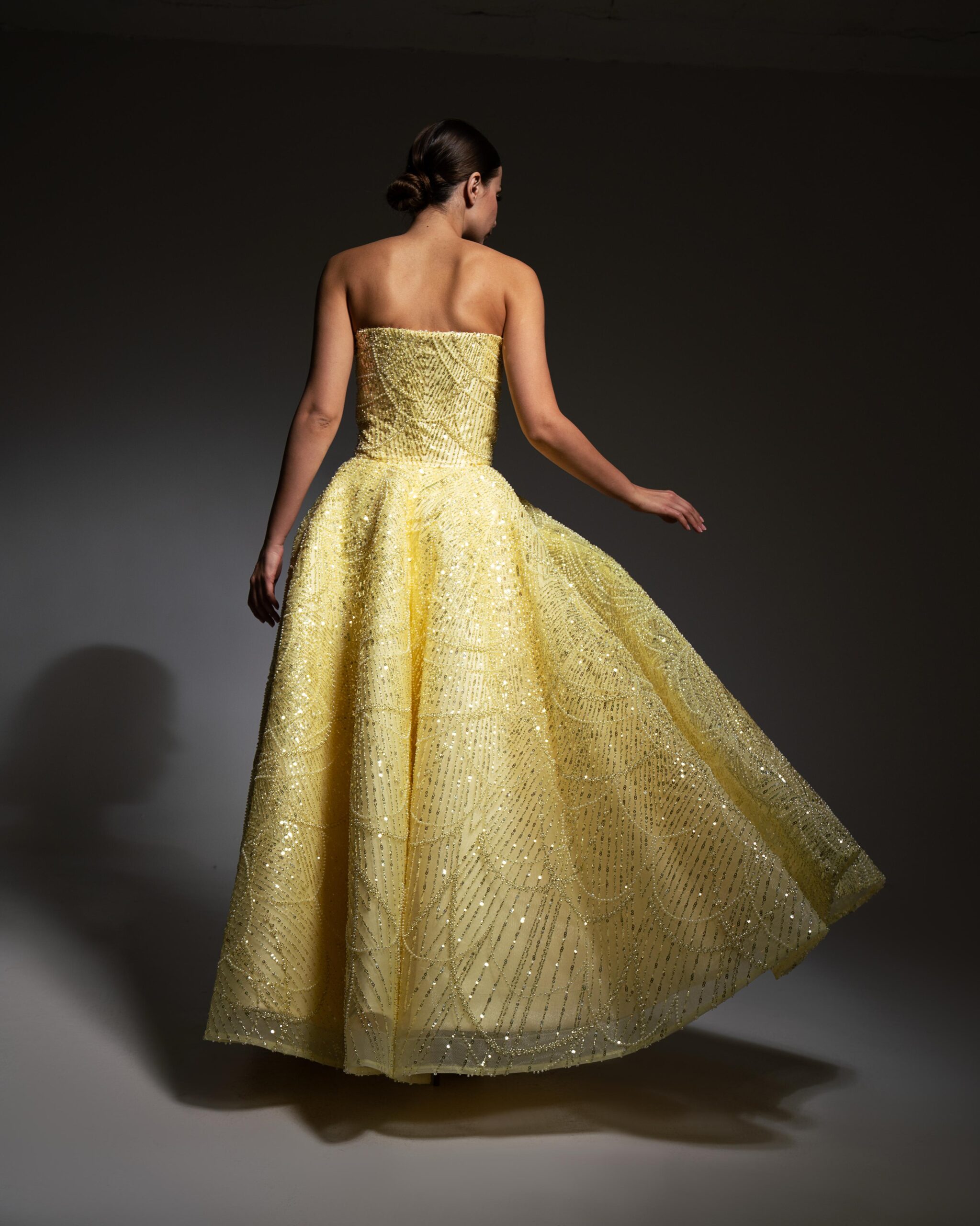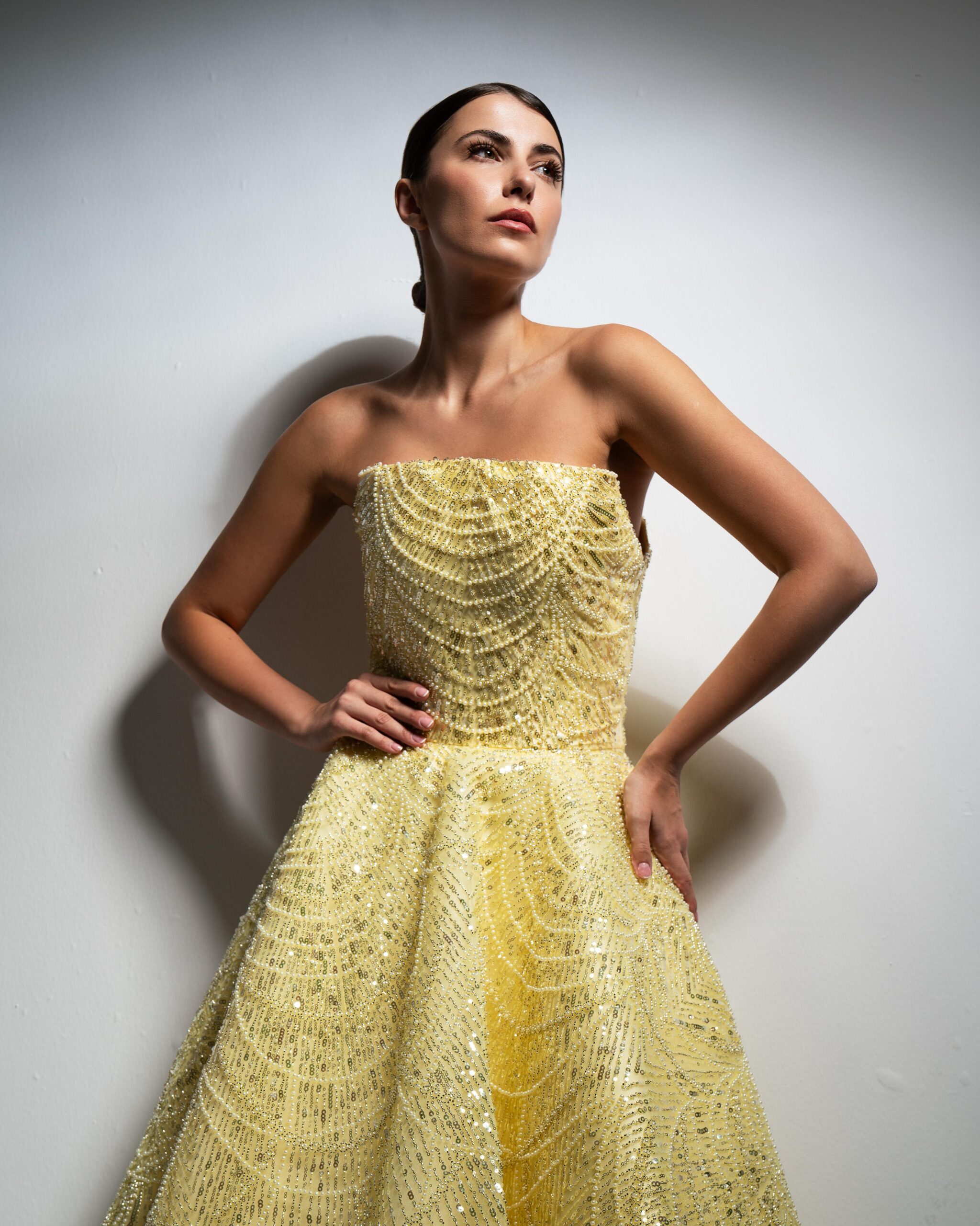 The “Nira” gown is a vision of golden elegance. This strapless A-line dress in a radiant pale yellow is fully encrusted with intricate geometric beadwork and sequins. A luxurious and structured choice that ensures you shine at any formal occasion.