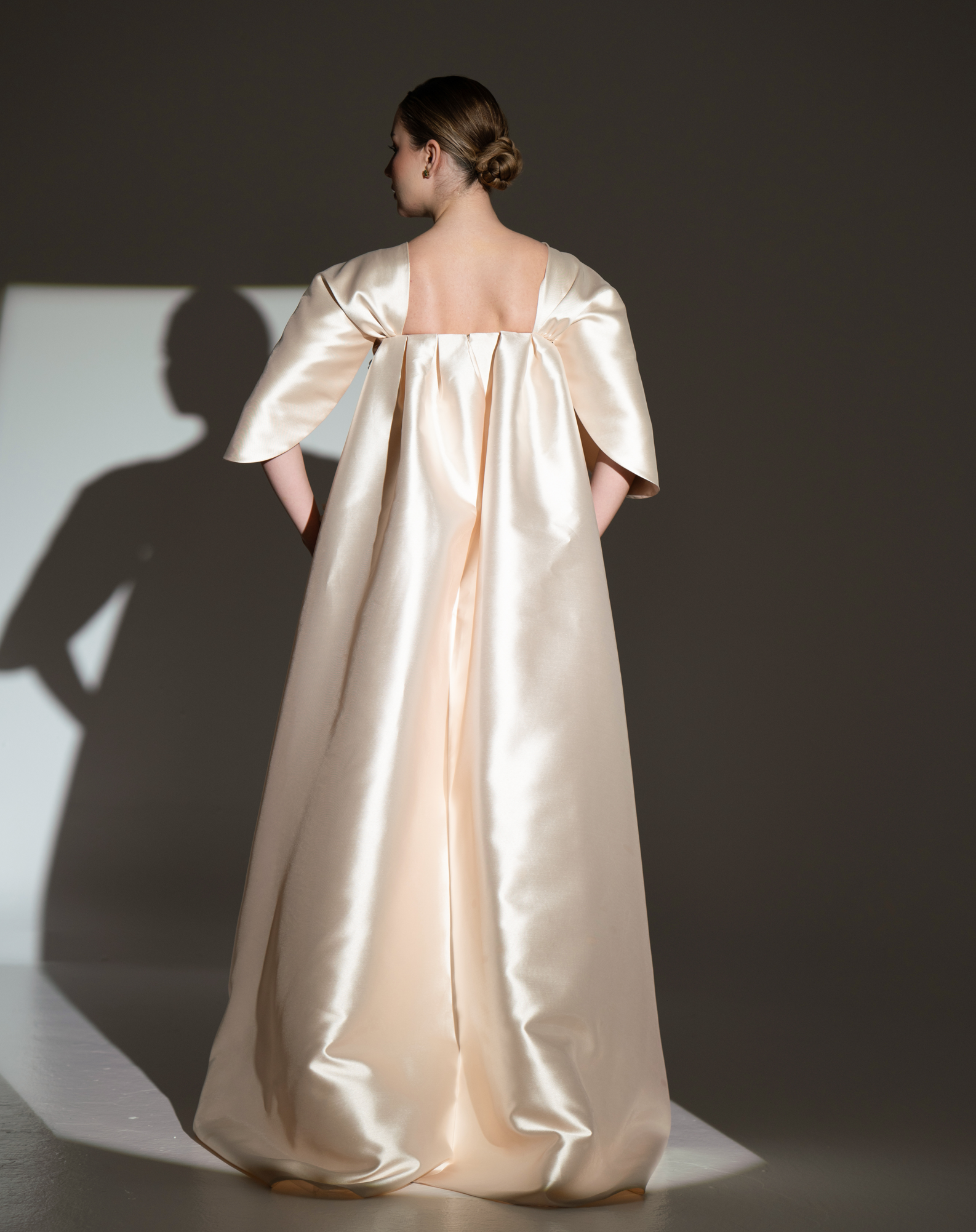 The “OpalĂ©” gown is a vision of modern royalty. A sleek champagne satin column dress featuring dramatic, structured cape sleeves that flow into a floor-length train. The bodice is beautifully embellished with 3D floral details for a romantic finish.