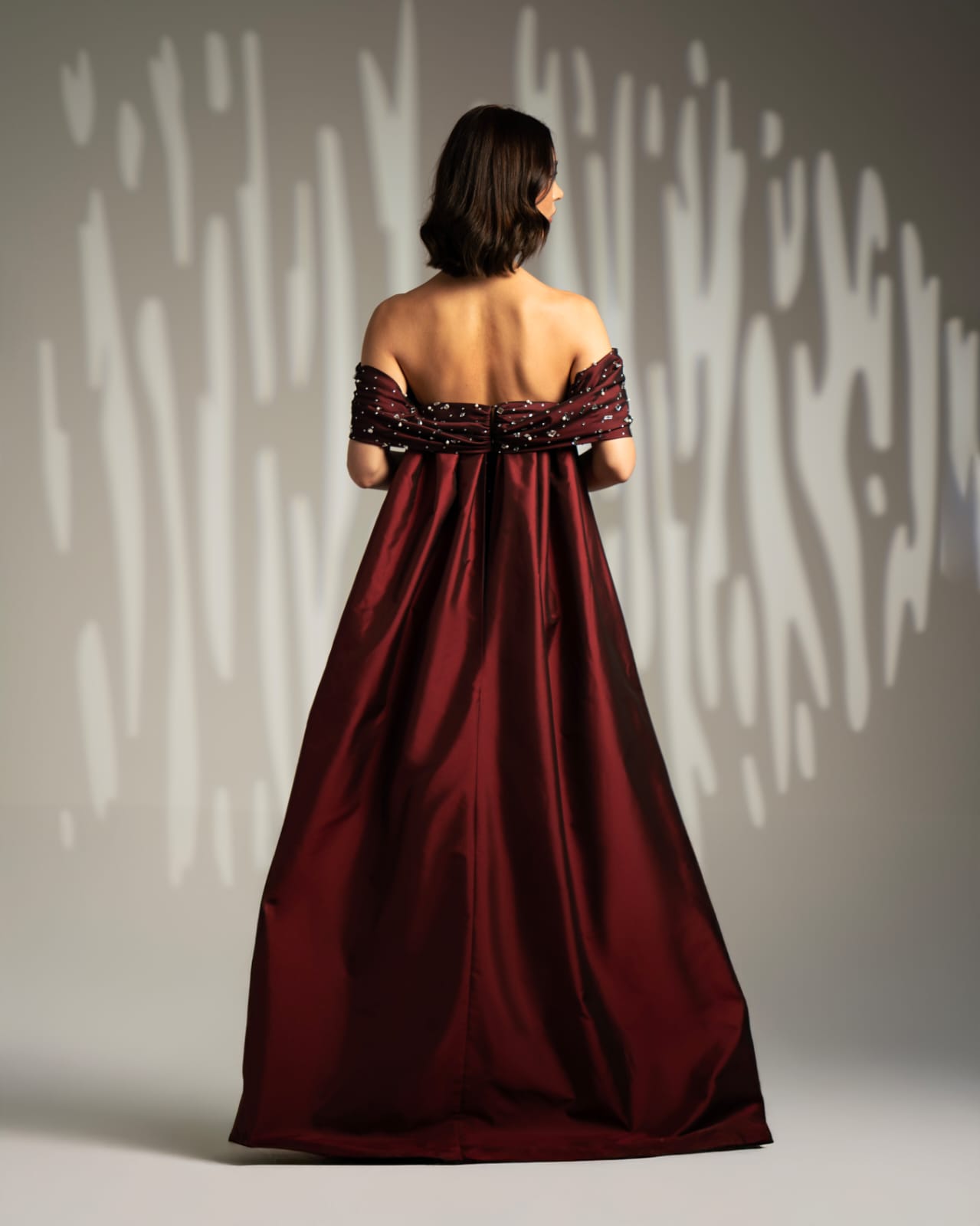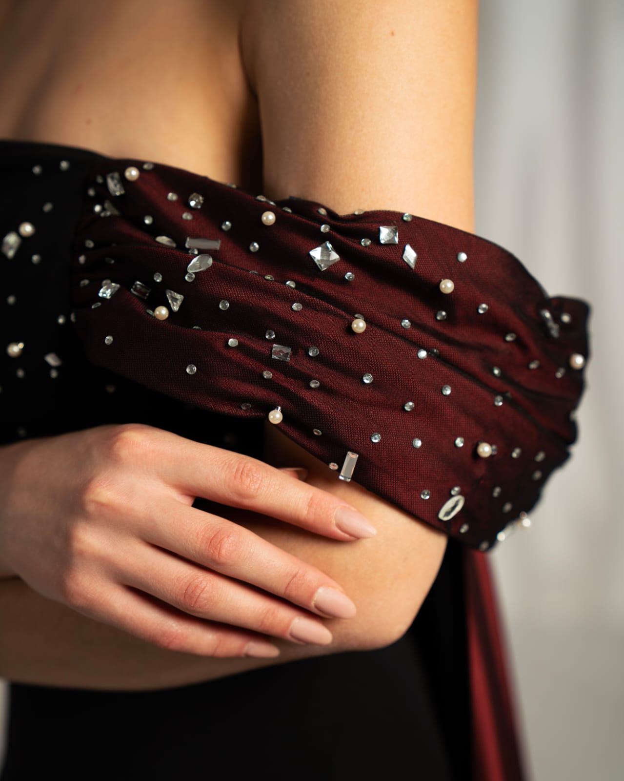 The “Ovel” gown offers elegant contrast. A sleek black fitted dress featuring a embellished bodice with scattered pearls and crystals. The look is framed by a dramatic off-the-shoulder neckline in ruched burgundy satin, creating a sophisticated two-tone effect.