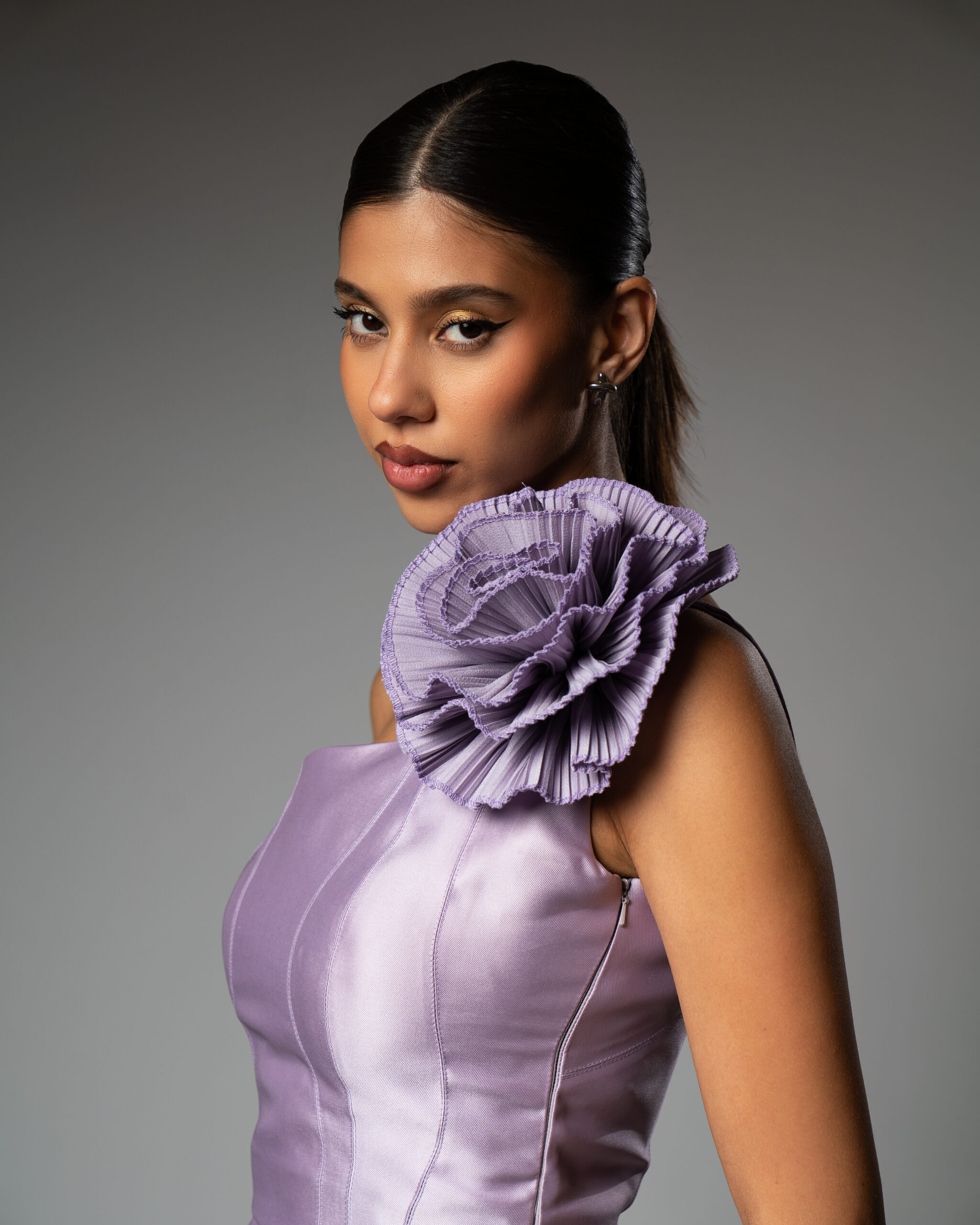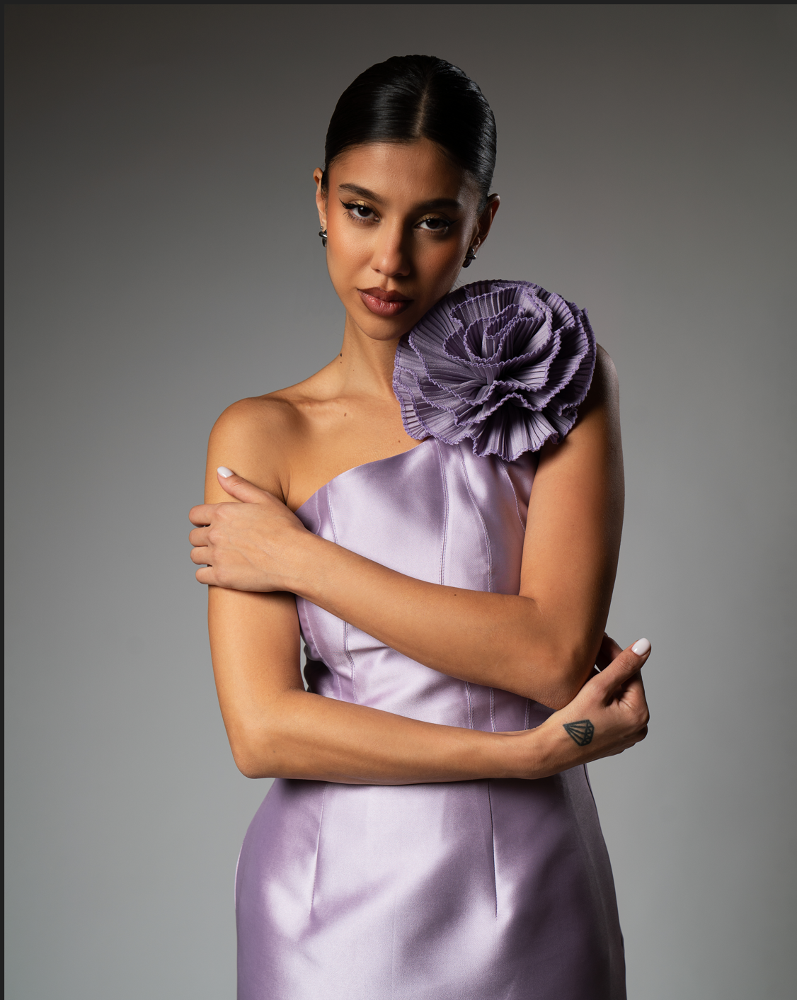 The “Rin” gown is a study in modern chic. A sleek, one-shoulder satin dress in a soft lavender hue, featuring a tailored column silhouette and a dramatic oversized floral rosette on the strap. Simple, structured, and effortlessly elegant.