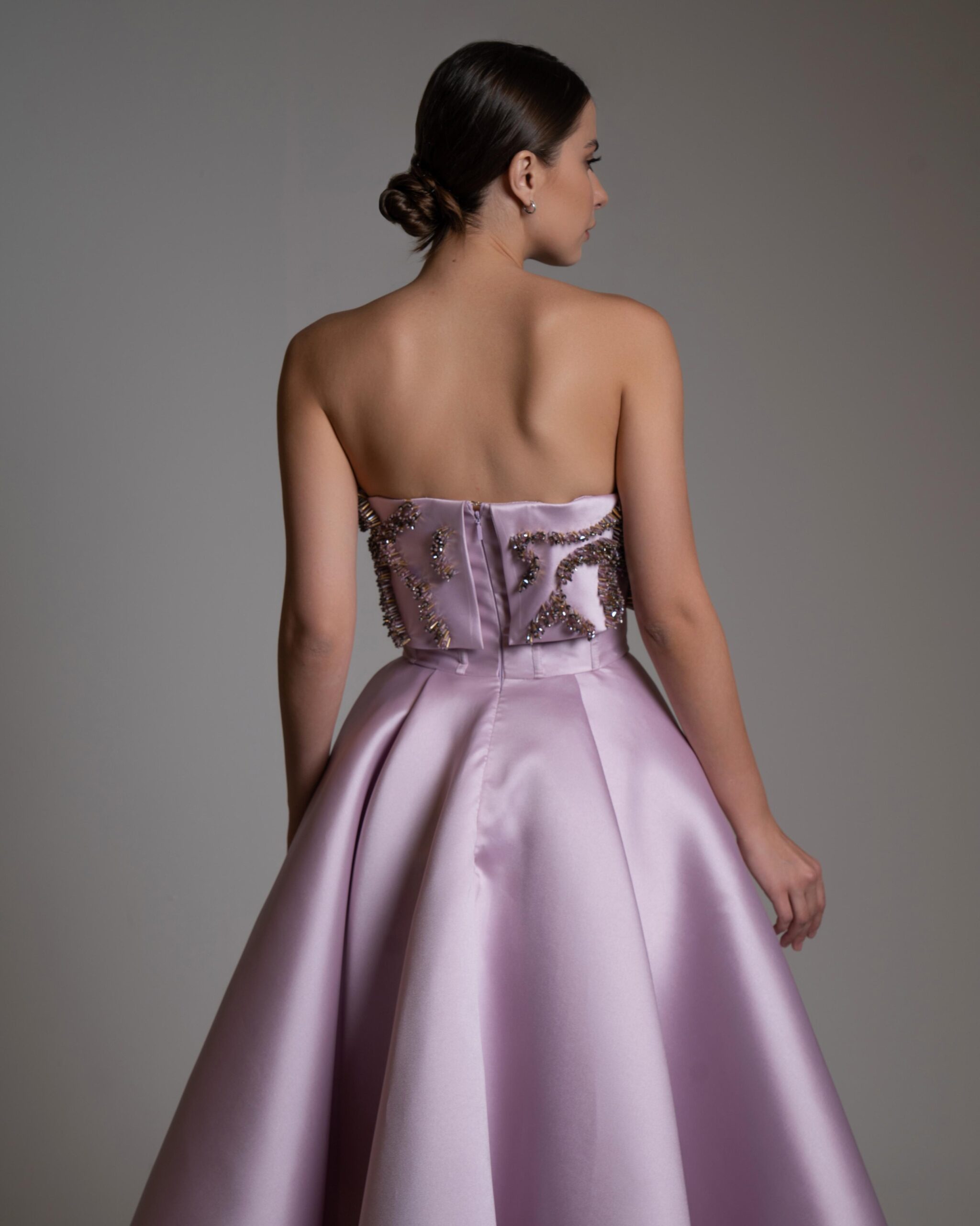The gown is crafted from high-luster satin in a soft, romantic shade of lilac-pink. The standout feature is the bodice, which showcases a strapless, folded-over overlay. This ruffle detail is heavily hand-embellished with intricate, dark metallic beading in an abstract organic pattern, creating a striking contrast against the pastel fabric.