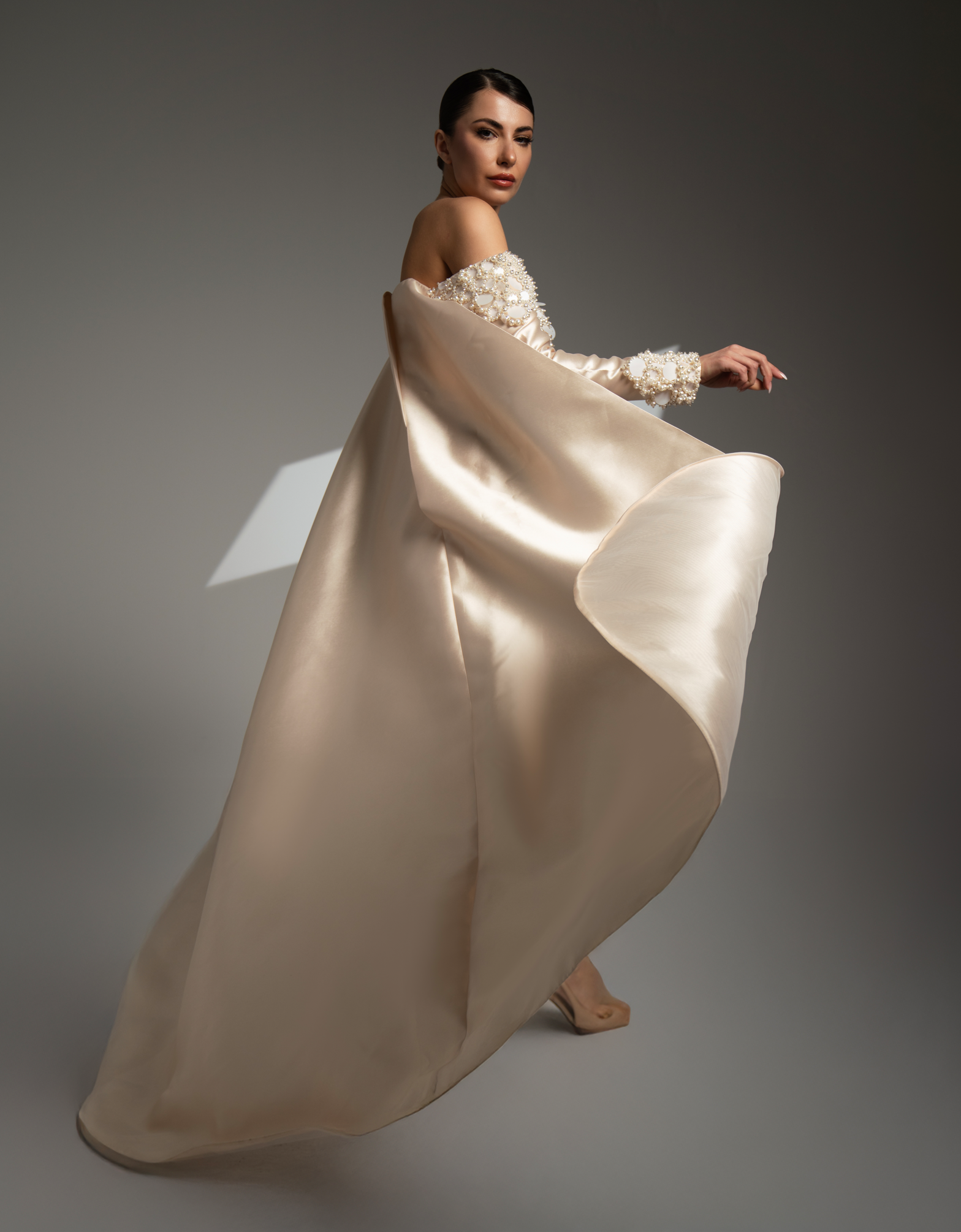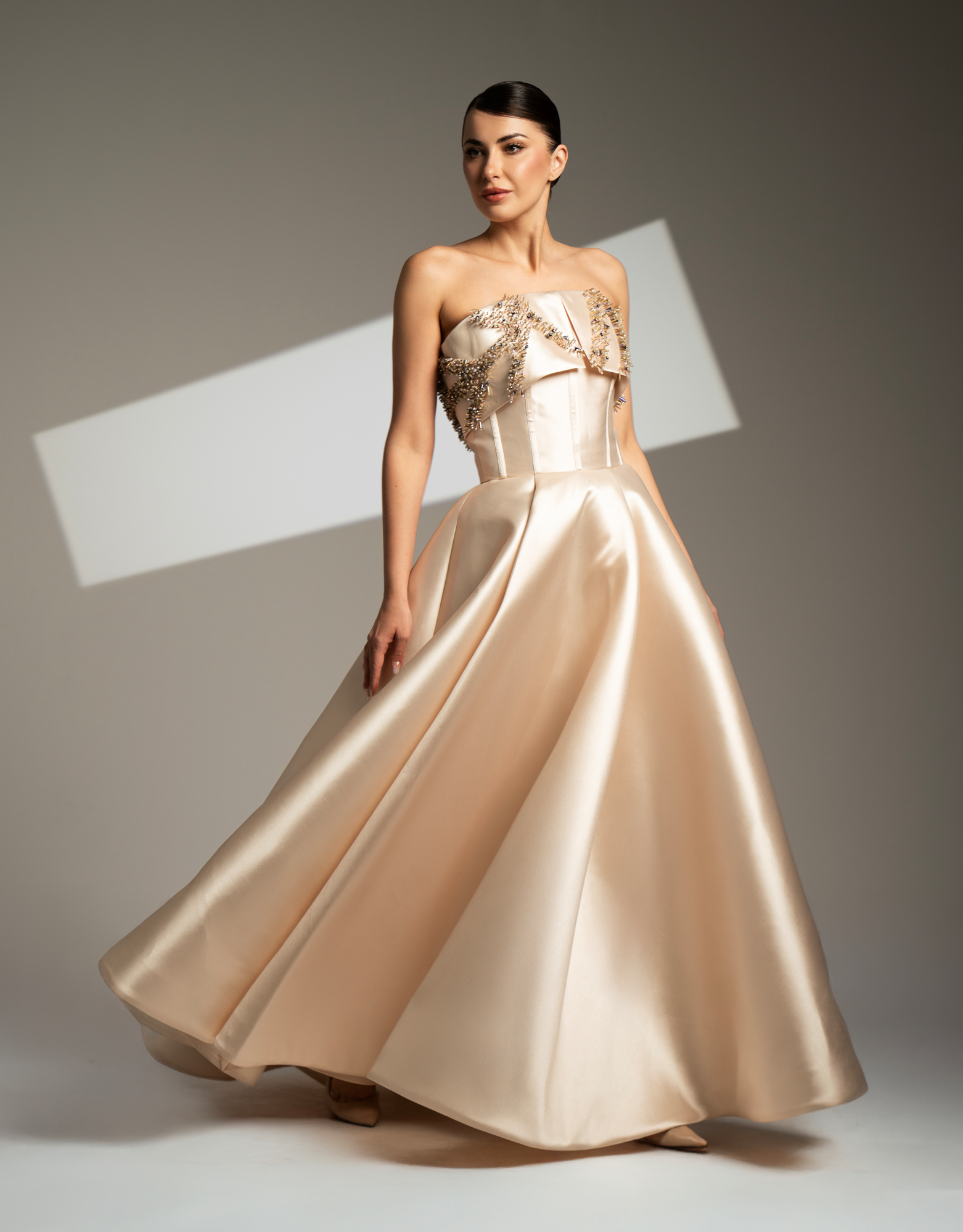 The “Saili” gown is a vision of golden elegance. A strapless champagne satin A-line dress featuring a structured corset bodice with visible boning. The neckline is highlighted by a unique folded detail, heavily encrusted with sparkling crystals and metallic beads.