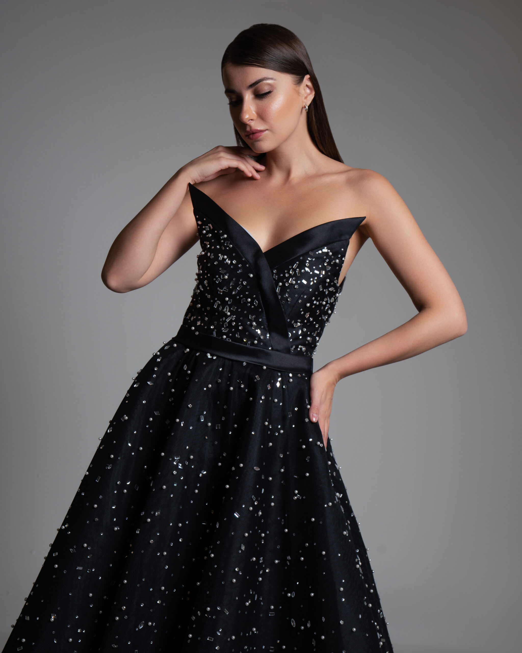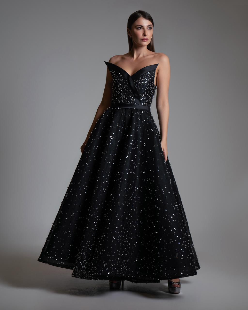 From the defined satin waistband, the skirt flows out into a classic A-line shape. The entire gown is crafted from fine black tulle lavishly embellished with scattered crystals and sequins. This creates a mesmerizing “starry night” effect, shimmering effortlessly with every step you take.