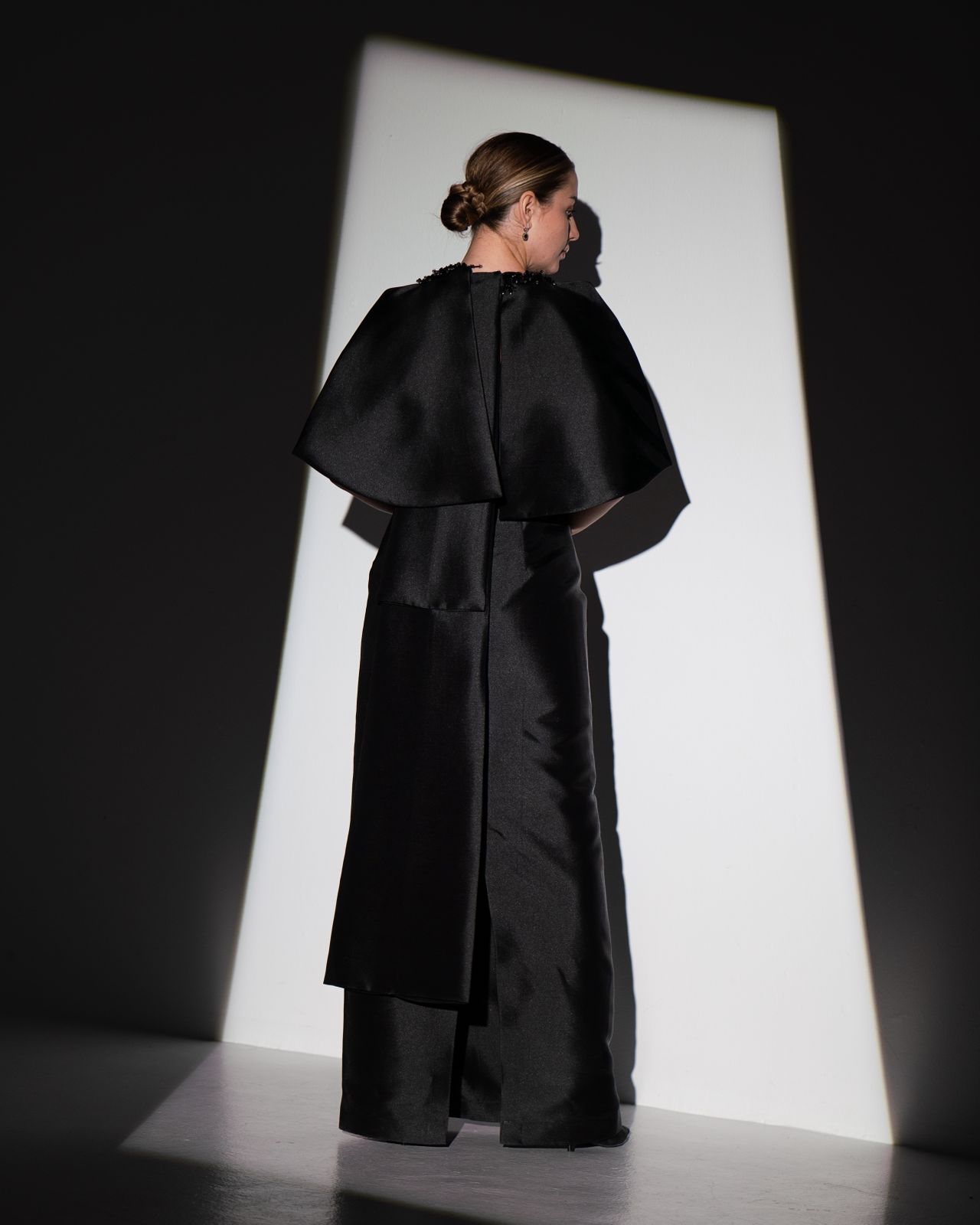 The “Sena” gown is effortlessly chic. A black satin dress featuring a modern structured capelet overlay and a high neckline adorned with intricate black beading. The tailored waist and sleek silhouette make it a sophisticated choice for any formal event.