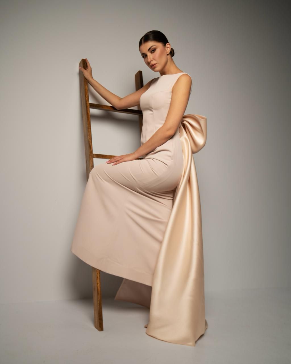 The “Serene” gown defines minimalist chic. A sleek, sleeveless column dress in a soft beige hue with a modest high neckline. The back features a stunning, oversized satin bow that flows into a dramatic train, offering a sophisticated “business in the front, party in the back” look.
