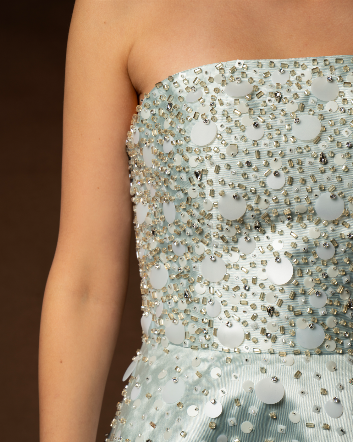 The defining characteristic of the “Silvya” is its unique, textured embellishment. The gown is meticulously adorned with large, light-reflecting paillettes (flat sequins) and intricate crystal beadwork. These embellishments are concentrated at the bodice and scatter downwards across the skirt, creating a mesmerizing “falling snow” or confetti effect that sparkles with every step.