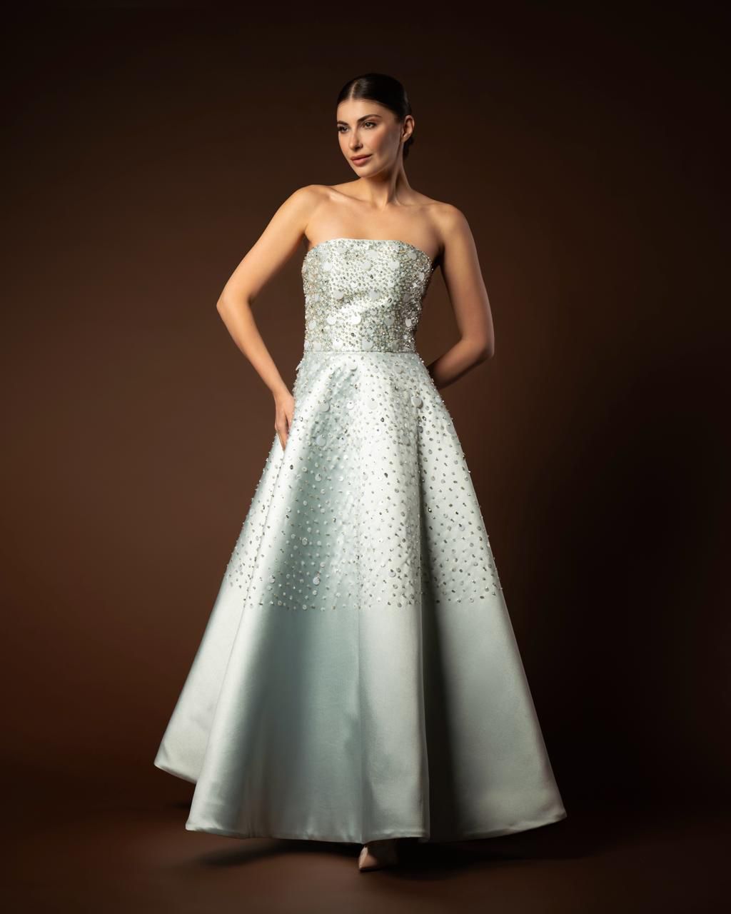 The “Silvya” gown is a vision of icy glamour. A strapless A-line dress in a pale silver-blue hue, heavily embellished with large paillettes and crystals that create a stunning, light-catching texture. A truly radiant choice for formal events.