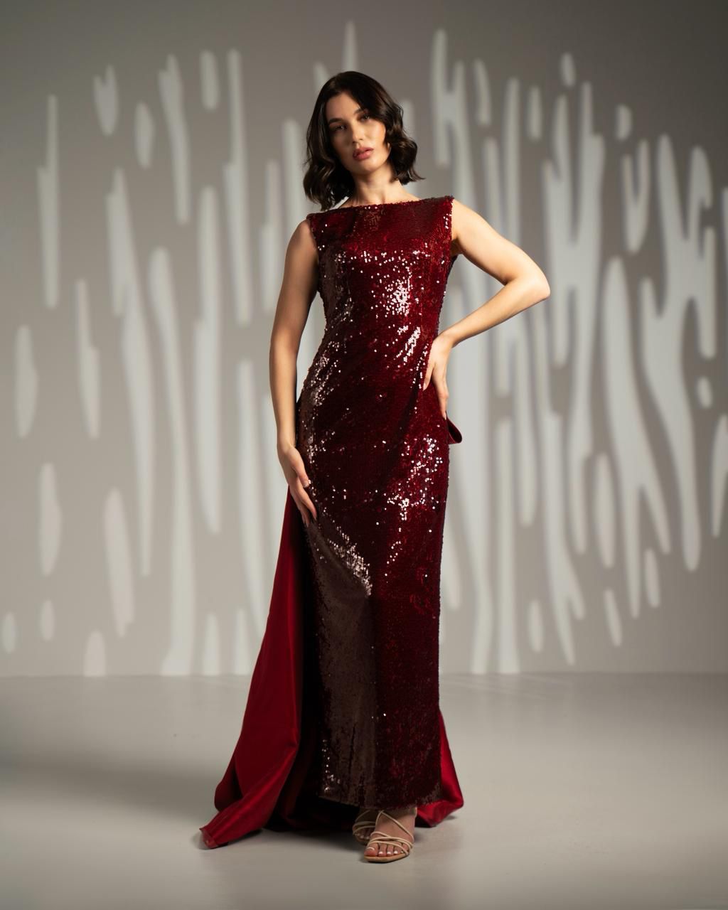 The “Tari” gown is a study in sleek glamour. A sleeveless column dress fully encrusted in deep burgundy sequins, featuring a sophisticated high neckline and a flowing back train. Perfect for those seeking a refined yet dazzling look.