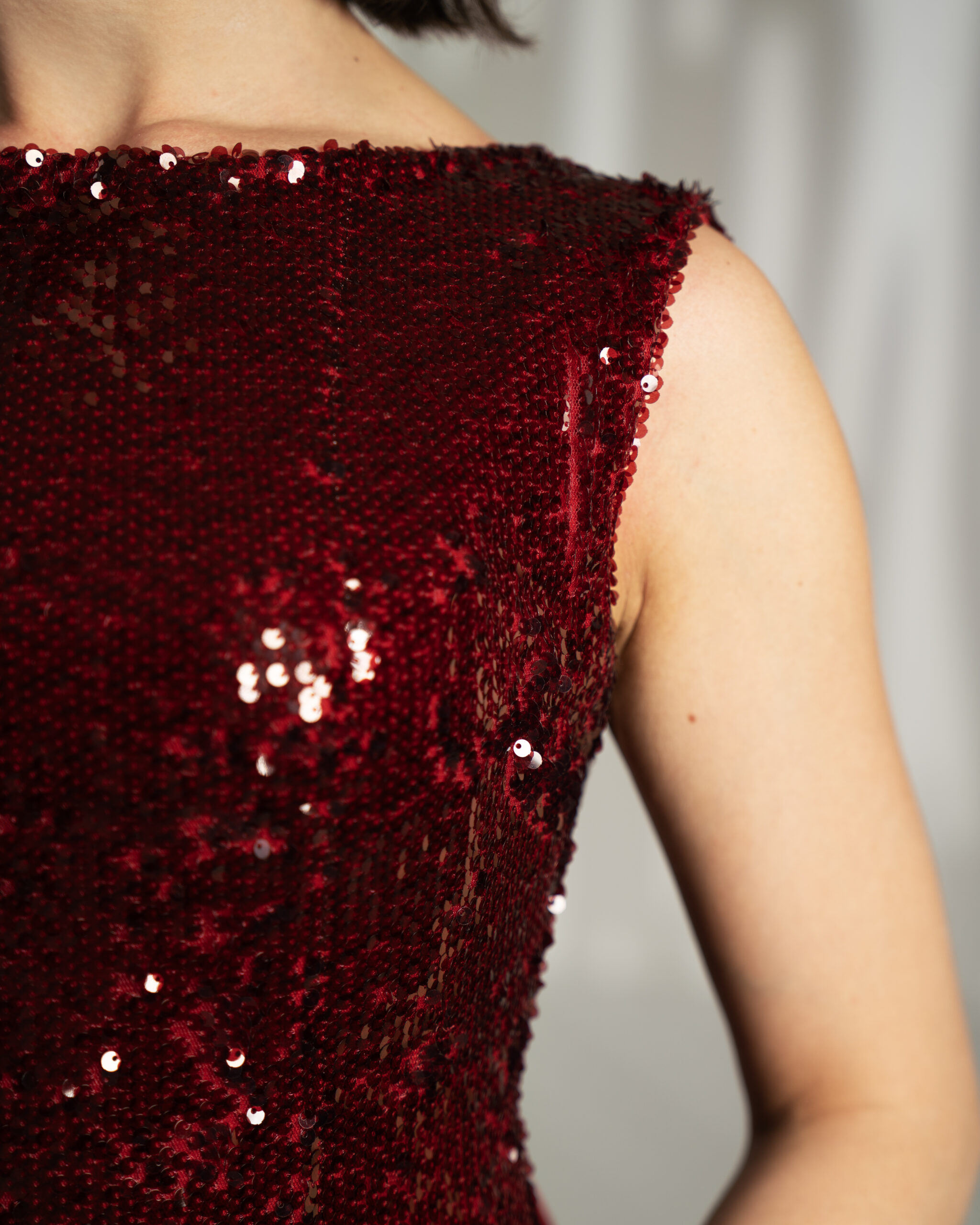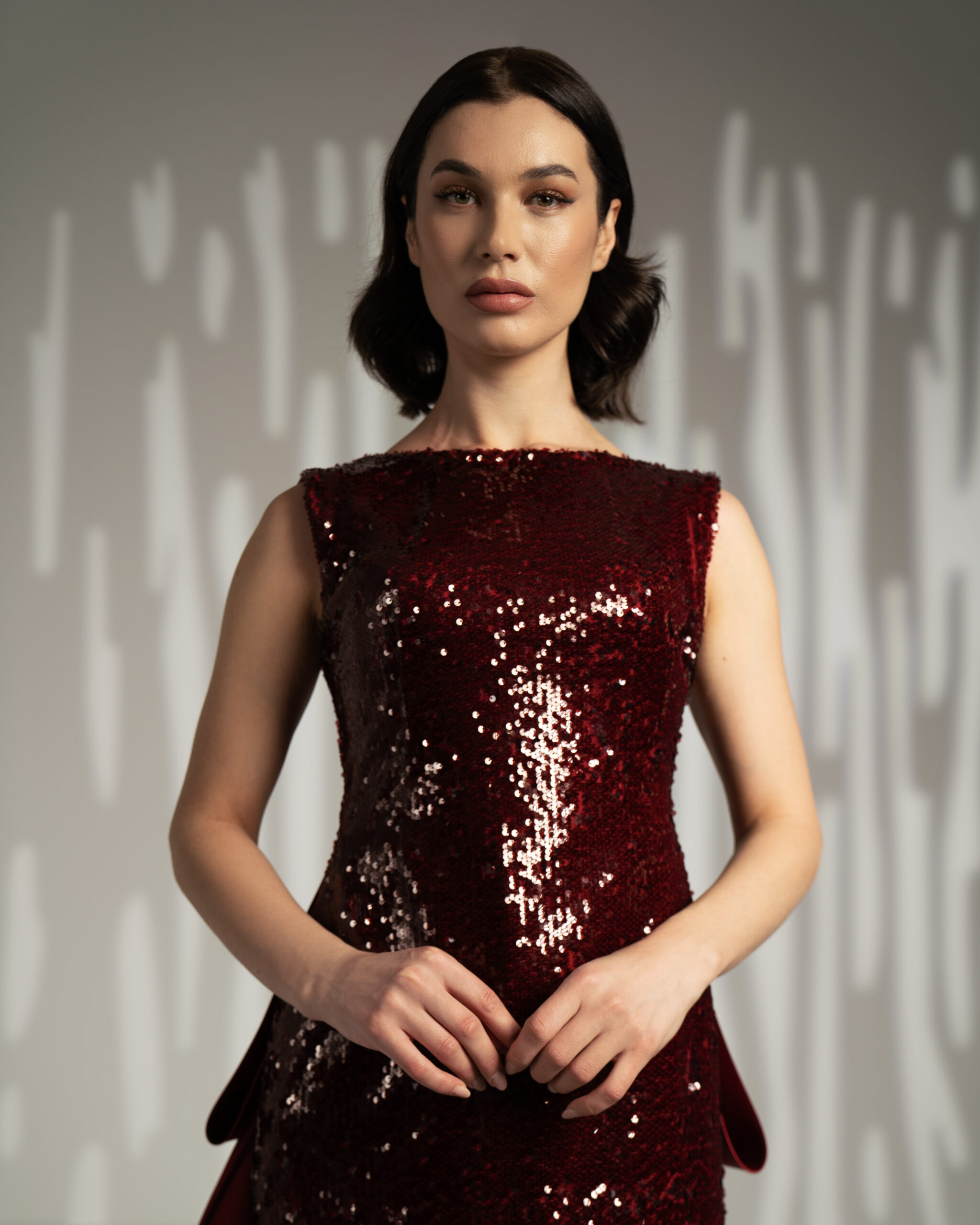 The gown is designed in a classic column silhouette that lengthens the body, crafted entirely from deep burgundy sequins that shimmer with a liquid-like effect. The modest, high boat neckline and sleeveless cut create a refined and polished front profile.